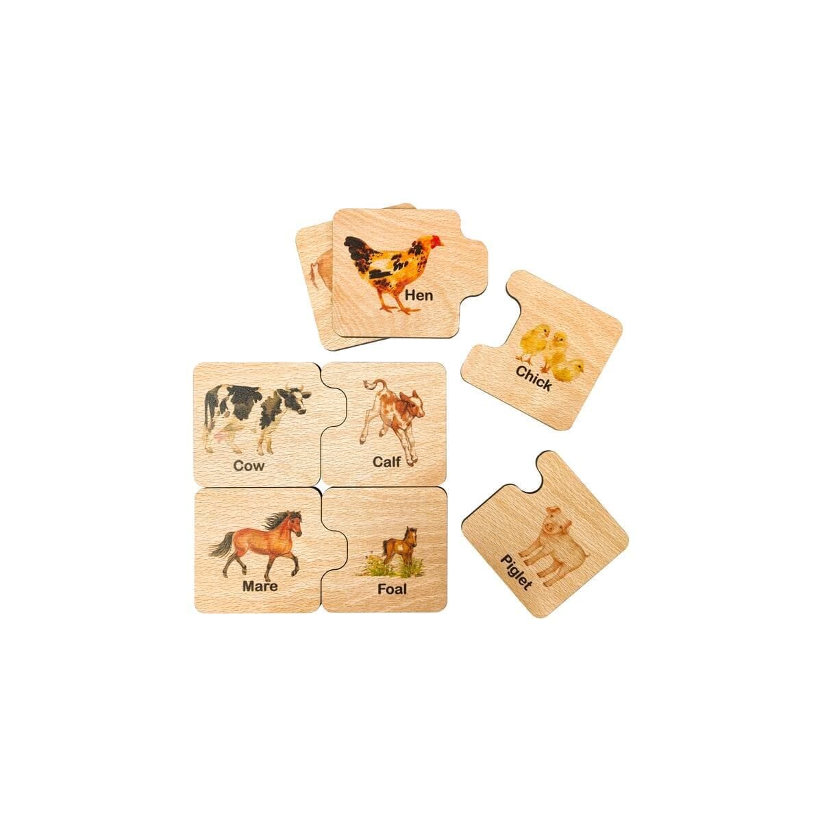 This puzzle is a delightful educational tool designed to help children build vocabulary and develop an understanding of animal family names. Featuring beautifully crafted wooden puzzle pieces, this set allows children to match each mother animal with her baby, learning the correct names for each pair—such as cow and calf, sheep and lamb, or horse and foal.
