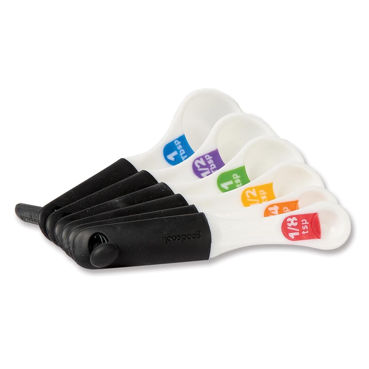 These heavy-duty plastic measuring spoons have easy-to-read measurements and non-slip handles. Individual spoons are easily removable from the flexible post that keeps them connected.